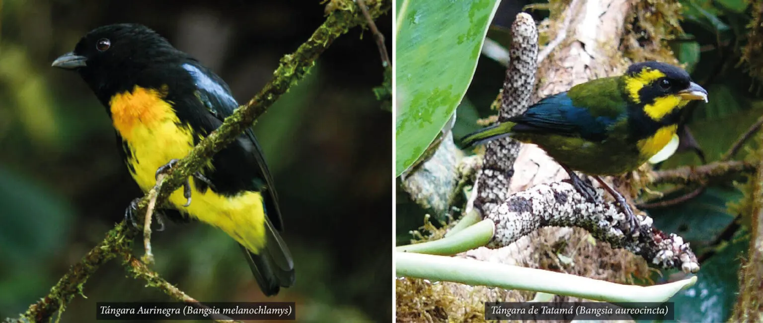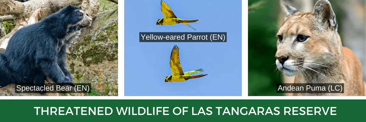 The Tangaras Reserve area was created by ProAves to protect two endemic bird species in danger of extinction: the Gold-ringed Tanager (Bangsia aureocincta) and the Black-and-gold Tanager (Bangsia melanochlamys), both categorized as Vulnerable according to the IUCN Red List. It is also home to 28 vertebrate species of conservation interest, 20 of which are endemic to Colombia, and 10 of which are under some category of threat, including some at risk of extinction as is the case of the Spectacled bear (Tremarctos ornatus).